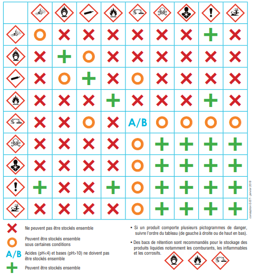 Les produits incompatibles doivent être séparés physiquement, et être entreposés sur des bacs de rétention distincts ; pas d’empilement, ni de placement sur des rayonnages superposés.